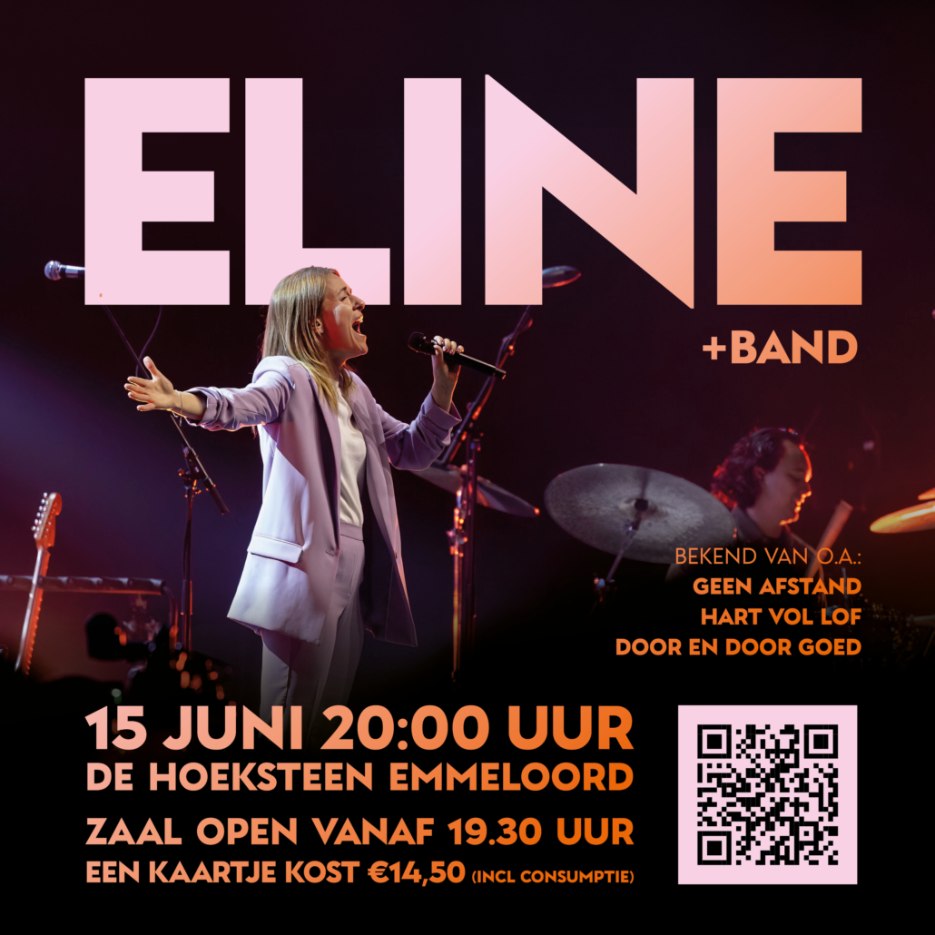 Zaterdagavond 15 juni komt ELINE naar De Hoeksteen! Om 19.30 gaat de zaal open en het concert start om 20.00. Kaartjes kosten €14,50, inclusief consumptie. Koop je kaartje via Concert ELINE + band (eventix.io) Uiteraard zijn mensen van buiten de Hoeksteen ook van harte welkom. Ben jij erbij?