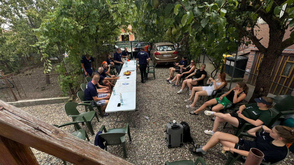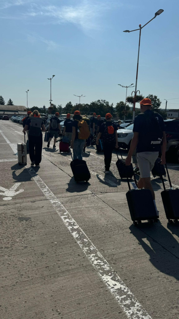 Nadat het inchecken en boarden voorspoedig was verlopen en iedereen al in het vliegtuig zat kwam het bericht dat we een half uur vertraging hadden. Hoe dan? We waren de eerst geplande vlucht van de dag. Met enige vertraging stegen we dus op en kwamen na een voorspoedige vlucht aan in Roemenië op het vliegveld van Cluj-Napoca. Nadat we onze koffers hadden gekregen stond Frank Stout ons al op te wachten. Het was een warm weerzien (letterlijk en figuurlijk want het was een graadje of 35).